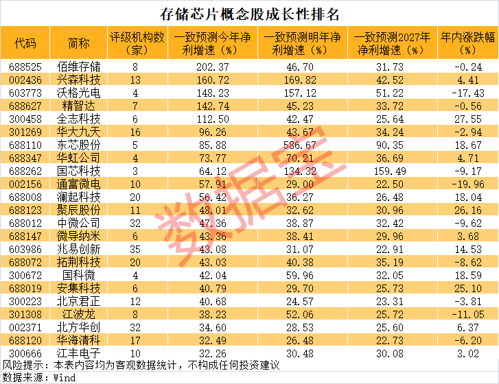 据数据宝统计,A股存储芯片概念股中,根据机构一致预测,有23股今年、明年及2027年净利增速均超20%,2024年研发支出逾亿元同时占营收比例超5%。这些高成长高科技的存储芯片概念股中,佰维存储、兴森科技、沃格光电、精智达、全志科技等个股机构一致预测今年净利翻倍增长。
