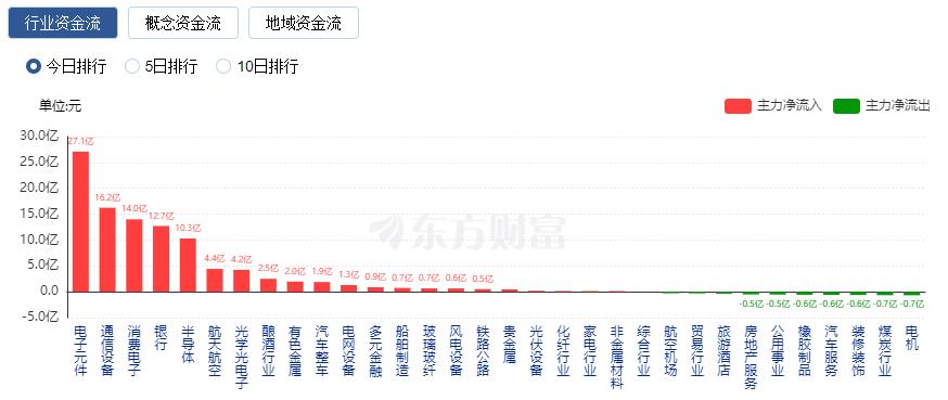 行业资金方面,截至收盘,电子元件、通信设备、消费电子等净流入排名靠前,其中电子元件净流入27.11亿。