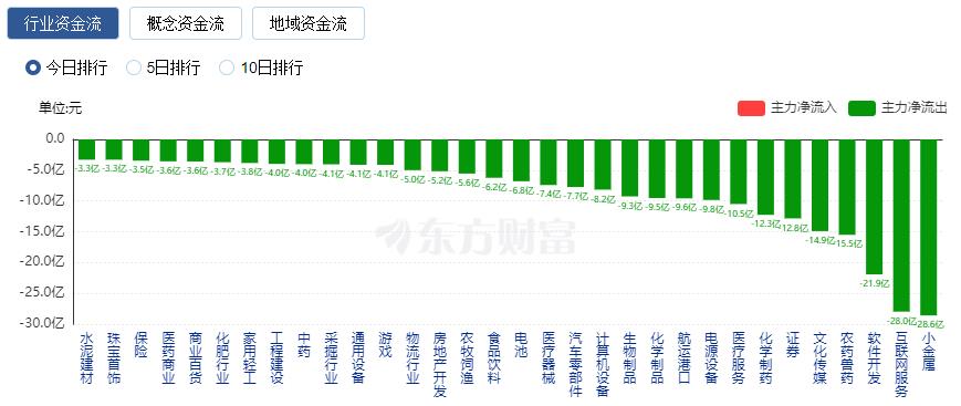 净流出方面,小金属、互联网服务、软件开发等净流出排名靠前,其中小金属净流出28.59亿元。