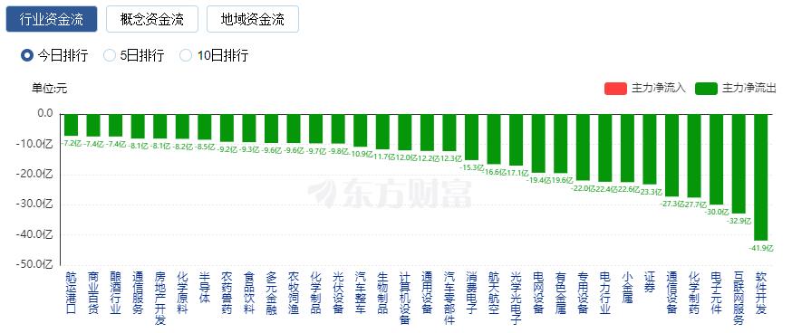 净流出方面,软件开发、互联网服务、电子元件等净流出排名靠前,其中软件开发净流出41.87亿元。