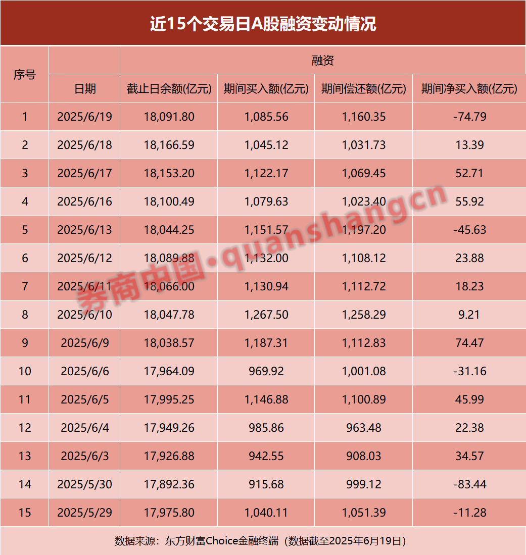 东方财富Choice数据显示,6月9日至6月19日期间,A股融资余额连续9日站上1.8万亿元大关,其中6月18日达到峰值18166.59亿元。