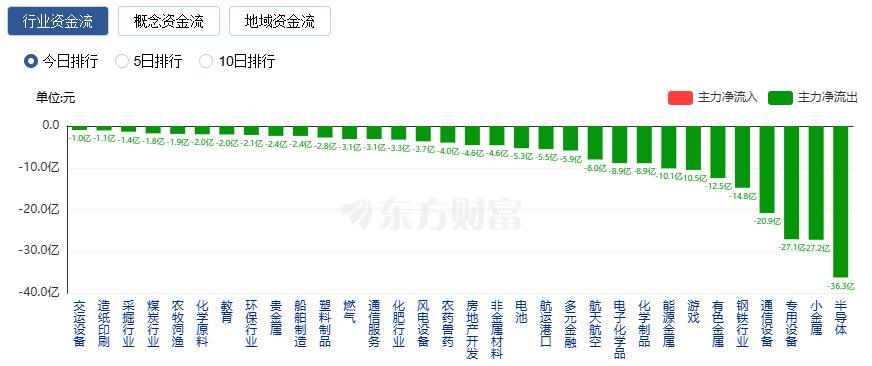 净流出方面,半导体、小金属、专用设备等净流出排名靠前,其中半导体净流出36.28亿元。