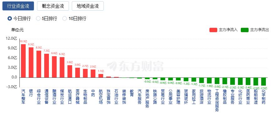 行业资金方面,截至收盘,汽车整车、银行、综合行业等净流入排名靠前,其中汽车整车净流入10.31亿。