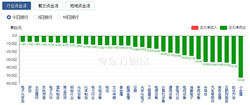 净流出方面,小金属、软件开发、互联网服务等净流出排名靠前,其中小金属净流出52.30亿元。