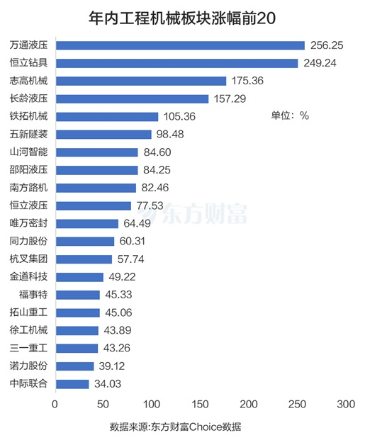 个股而言,万通液压年内累计上涨256.25%,成为工程机械板块的“涨幅王”。恒立钻具紧随其后,年内上涨249.24%。长龄液压、铁拓机械年内也翻倍,涨幅分别为157.29%和105.36%。8月14日首发上市的志高机械,上市以来涨幅为175.36%。整体而言,工程机械板块的上涨中位数为43.26%。