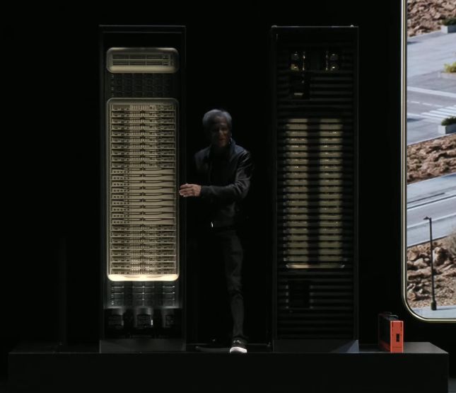 现场也展示了英伟达的液冷AI服务器机架。黄仁勋比划称,1吉瓦数据中心需要8000个这样的机架。单个机架重达2吨,由150万个零部件构成。