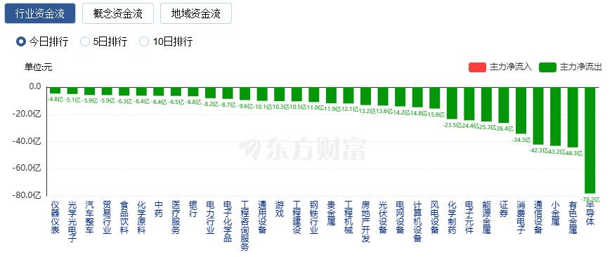 净流出方面,半导体、有色金属、小金属等净流出排名靠前,其中半导体净流出78.20亿元。