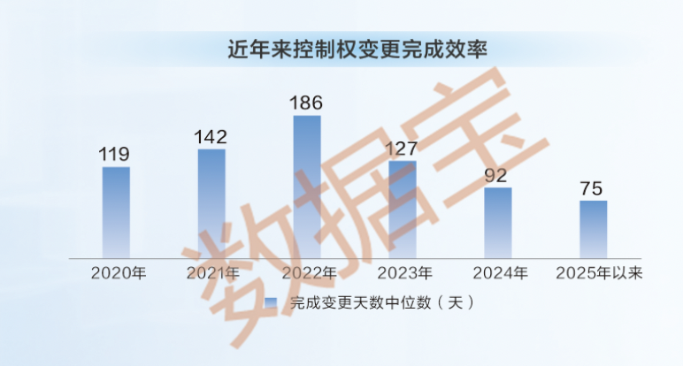 最后是控制权交易的效率相比以往更高。数据显示,今年以来成功实现控制权变更的公司,从筹划到完成的耗时中位数仅为75天,创出最快纪录。其中,焦作万方、利源股份、三佳科技、神剑股份等公司控制权交易耗时均不足30天就宣告完成。