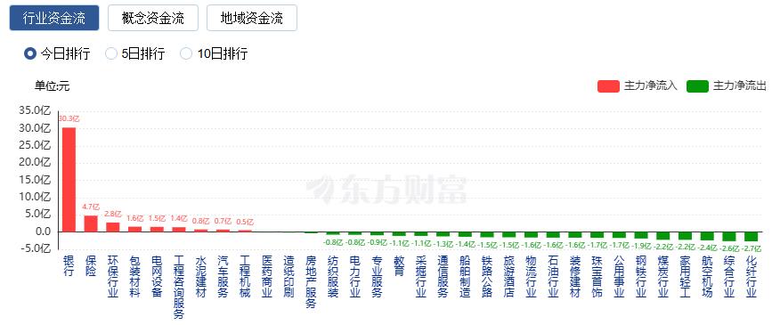 行业资金方面,截至收盘,银行、保险、环保行业等净流入排名靠前,其中银行净流入30.27亿。