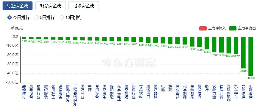 净流出方面,电网设备、文化传媒、汽车整车等净流出排名靠前,其中电网设备净流出42.61亿元。