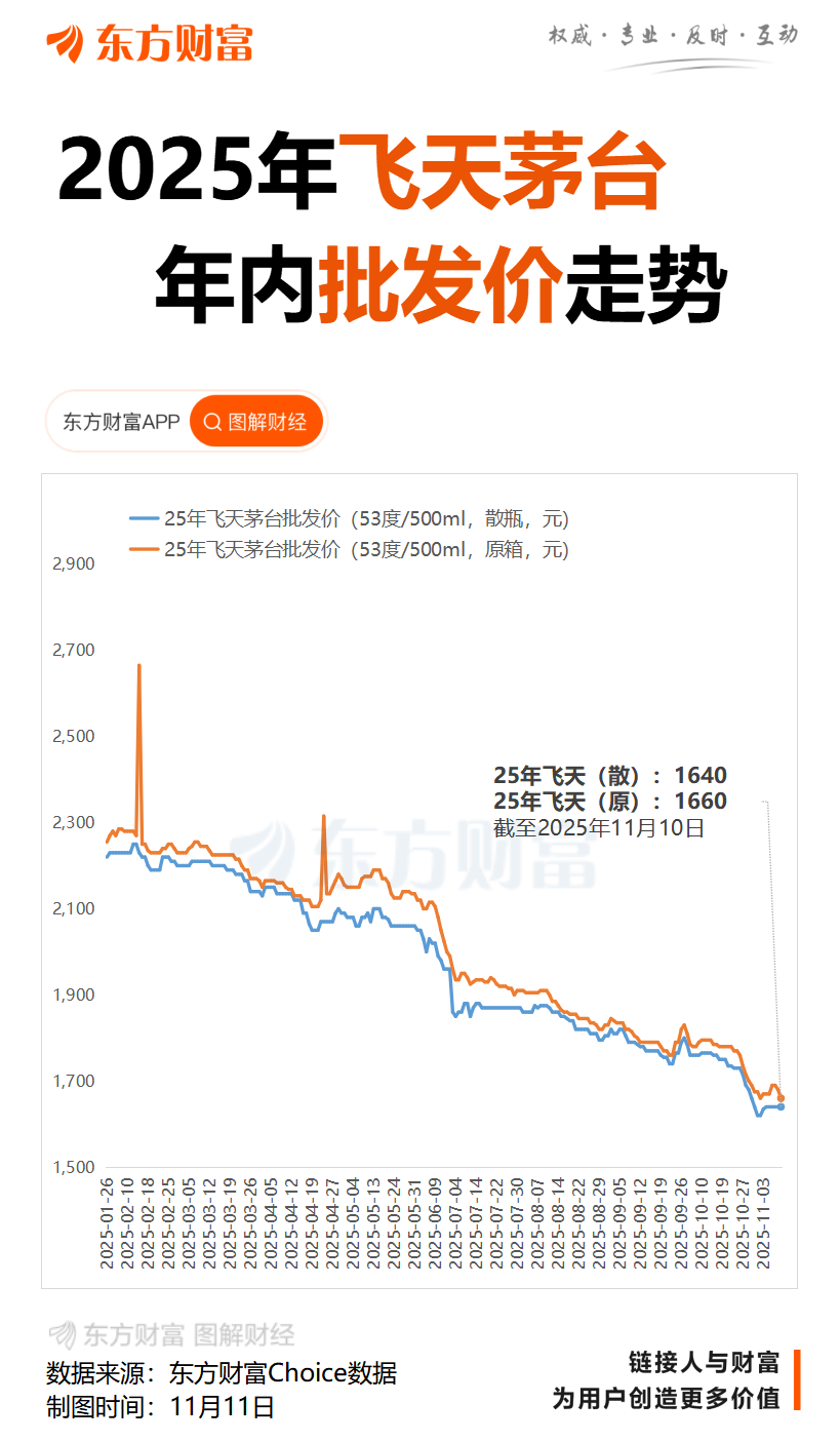 据第三方平台“今日酒价”披露数据显示,11月10日,25年飞天散瓶(53度/500ml)与前一日持平,报1640元/瓶;25年飞天原箱较前一日下跌15元,报1660元/瓶。据该平台年初披露的数据,2025年飞天茅台散瓶及原箱的批发参考价均超2200元/瓶。此外,规格为52度/500ml的五粮液普五(八代)批发参考价报855元/瓶,年初报价为950元/瓶;国窖1573(52度/500ml)批发参考价为850元/瓶,年初报价为860元/瓶。