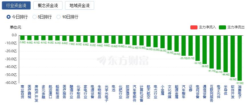 净流出方面,消费电子、软件开发、半导体等净流出排名靠前,其中消费电子净流出57.04亿元。