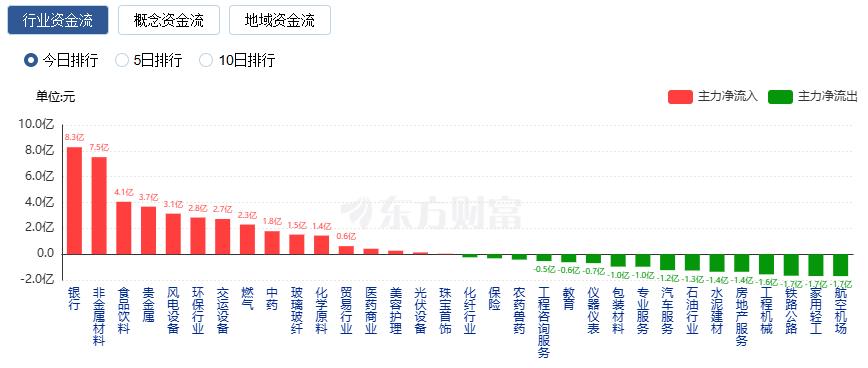 行业资金方面,截至收盘,银行、非金属材料、食品饮料等净流入排名靠前,其中银行净流入8.28亿。