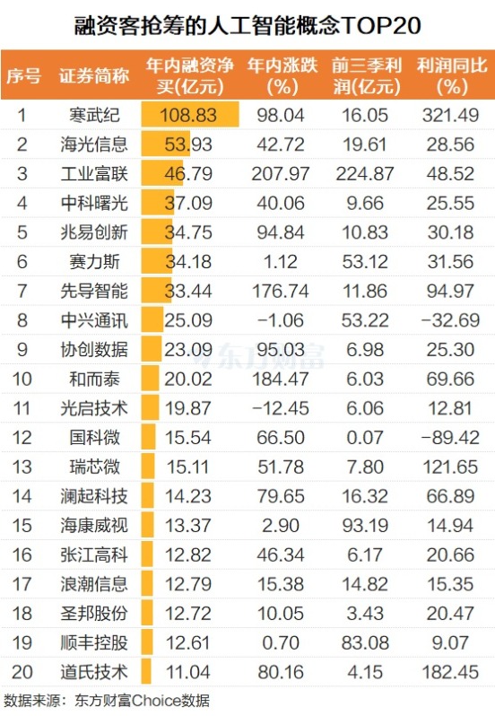 从股价表现来看,融资客融资净买入前20个股中,工业富联、先导智能、和而泰年内均是翻倍。寒武纪、兆易创新、协创数据涨幅超过90%。