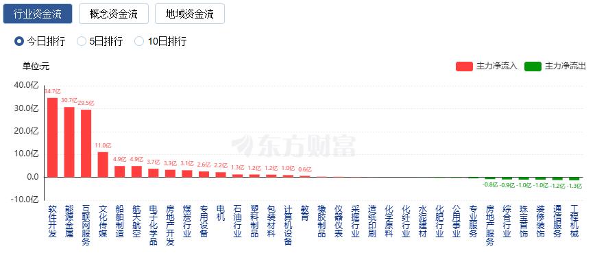 行业资金方面,截至收盘,软件开发、能源金属、互联网服务等净流入排名靠前,其中软件开发净流入34.68亿。
