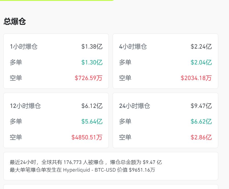 据Coinglass数据显示,24小时内,全网共有176721人被爆仓,爆仓总金额为9.47亿美元(约合人民币67亿元)。
