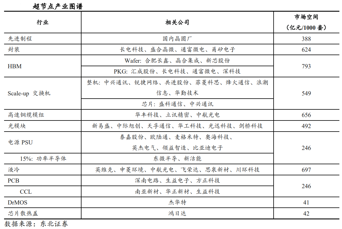 以华为Atlas950作为测算标准,假设年出货1000套,各环节占比分别为:先进制程晶圆代工约388亿元、封装约624亿元、HBM约793亿元,Scale-up交换芯片约549亿元,高速铜缆模组约656亿元,光模块约492亿元,电源约246亿元,液冷约697亿元,PCB约246亿元,DrMOS约41亿元,散热盖约42亿元。
