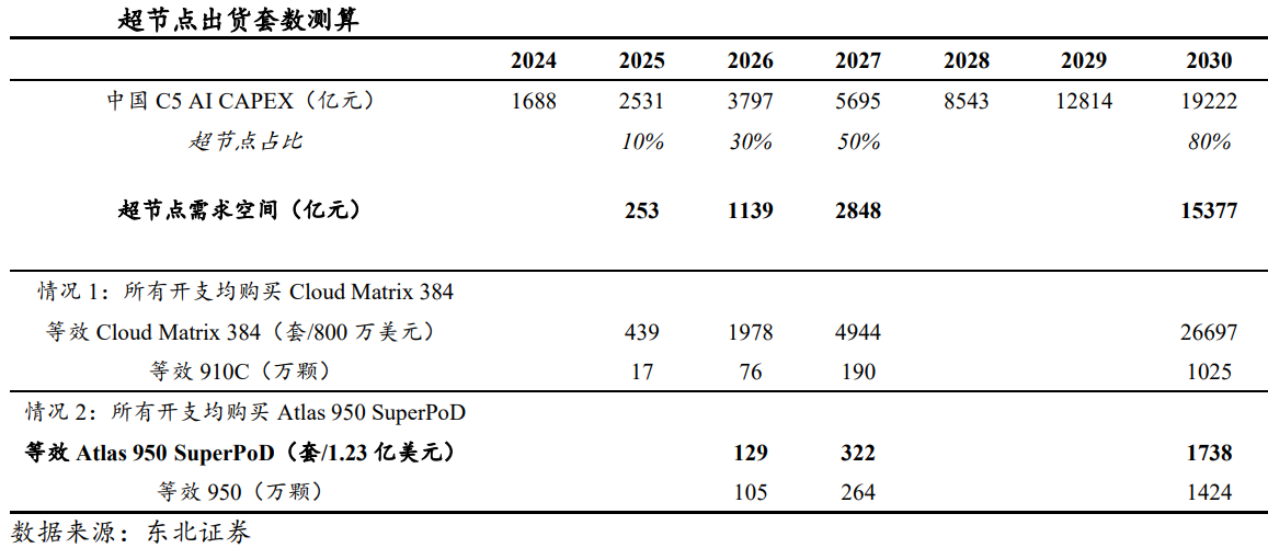 预计中国互联网C5(阿里巴巴、字节跳动、腾讯、美团及百度)AI基础设施资本开支将从1688亿元增长至1.92万亿元。超节点作为高密度算力部署的核心基础设施,其在C5资本开支中的占比将随时间快速提升,假设该占比从2025年的10%上升至2030年的约80%,对应的超节点需求空间将从2025年的253亿元增至2030年的1.54万亿元。