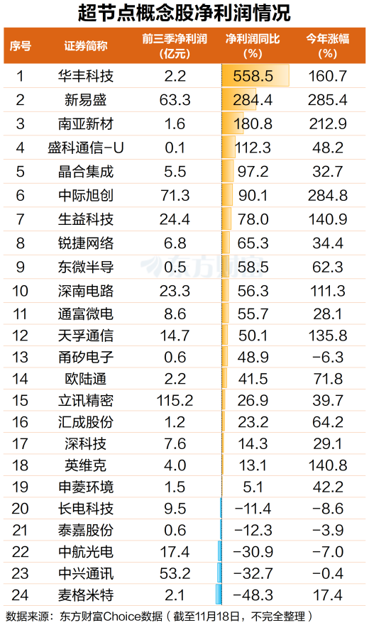 从超节点产业链公司的业绩情况看,今年整体表现亮眼,业绩大增的个股不在少数。据东方财富Choice数据,超节点概念股今年前三季度净利润多数同比增长(不完全整理),其中华丰科技、新易盛、南亚新材、盛科通信-U等增速居前,均超100%;晶合集成、中际旭创、生益科技、锐捷网络等8股,增速均超50%。