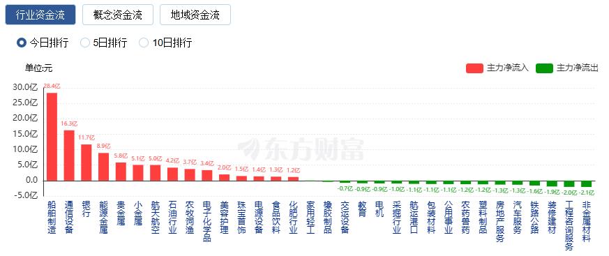 行业资金方面,截至收盘,船舶制造、通信设备、银行等净流入排名靠前,其中船舶制造净流入28.36亿。