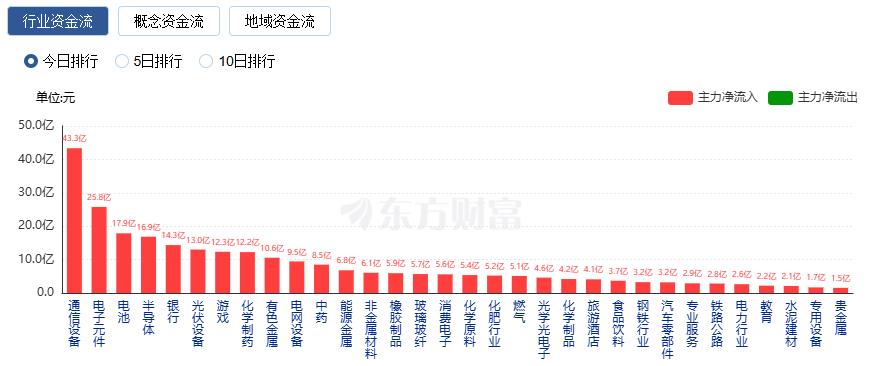 行业资金方面,截至收盘,通信设备、电子元件、电池等净流入排名靠前,其中通信设备净流入43.35亿。