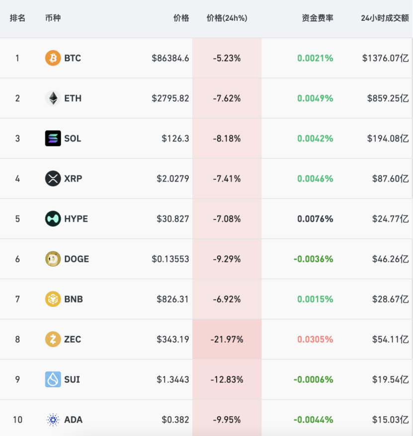 消息面上,加密货币亦遭遇猛烈抛售,比特币一度跌破8.4万美元,最低跌至8.38万美元,截至发稿,比特币大跌超5%,以太坊、XRP、HYPE大跌超7%,DOGE币暴跌超9%,ZEC币暴跌超21%。
