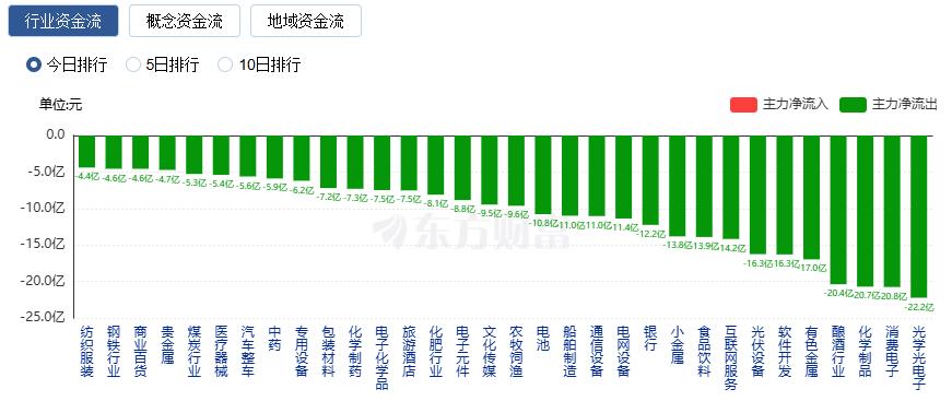 净流出方面,光学光电子、消费电子、化学制品等净流出排名靠前,其中光学光电子净流出22.23亿元。