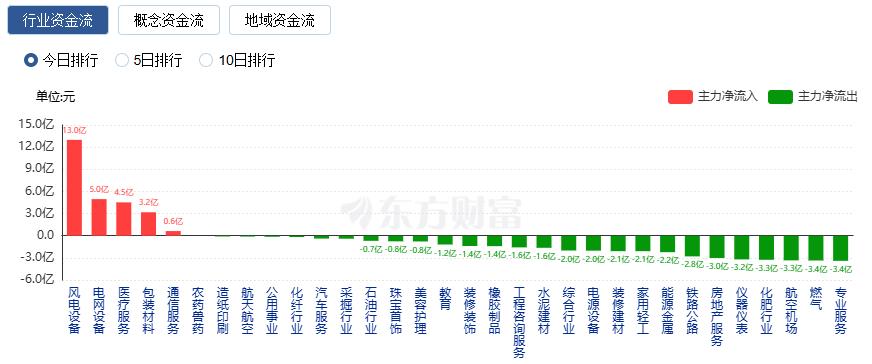 行业资金方面,截至收盘,风电设备、电网设备、医疗服务等净流入排名靠前,其中风电设备净流入12.99亿。