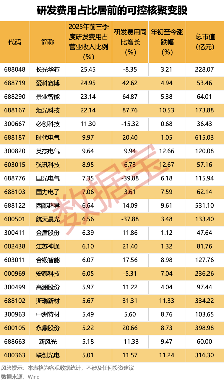 据证券时报·数据宝统计,A股中布局可控核聚变的个股有59只。数据显示,22股2025年前三季度研发费用占营业收入比例在5%以上,长光华芯、爱科赛博、景业智能、炬光科技居前,均超过20%。