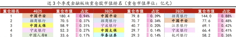 从2025Q2-2025Q4的三个季度来看,公募基金对金融股的持股来看,前五大重仓股中,保险股越来越多,2025Q2只有中国平安,Q3有中国平安和中国太保,Q4有中国平安、中国太保和中国人寿。
